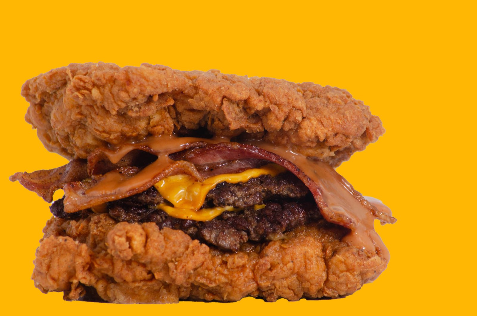 Doble pollo frito, doble smash burger, doble queso cheddar, cebolla caramelizada, tocino y salsa chickengo