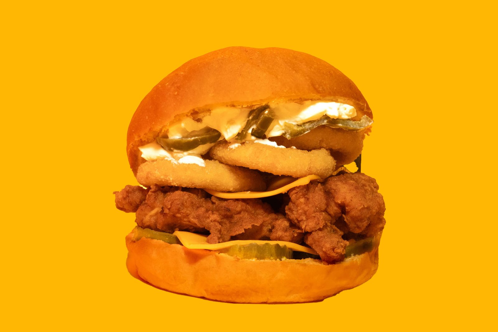 Pollo frito, pepinillos, doble queso cheddar, aros de cebolla, queso crema y jalapeños